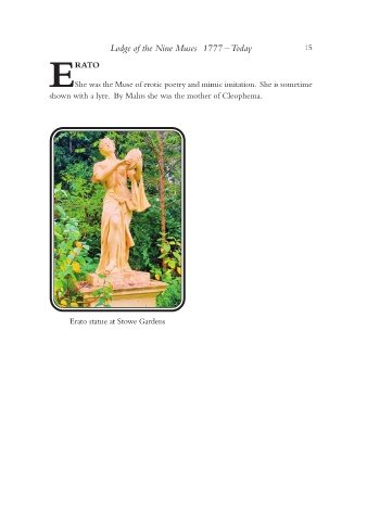 Lodge of the Nine Muses 1777 – Today 15 RATO EShe was the Muse of erotic poetry and mimic imitation. She is sometime shown with a lyre. By Malus she was the mother of Cleophema. Erato statue at Stowe Gardens