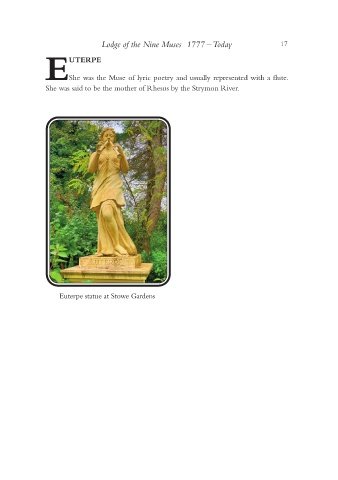 Lodge of the Nine Muses 1777 – Today 17 UTERPE EShe was the Muse of lyric poetry and usually represented with a flute. She was said to be the mother of Rhesus by the Strymon River. Euterpe statue at Stowe Gardens